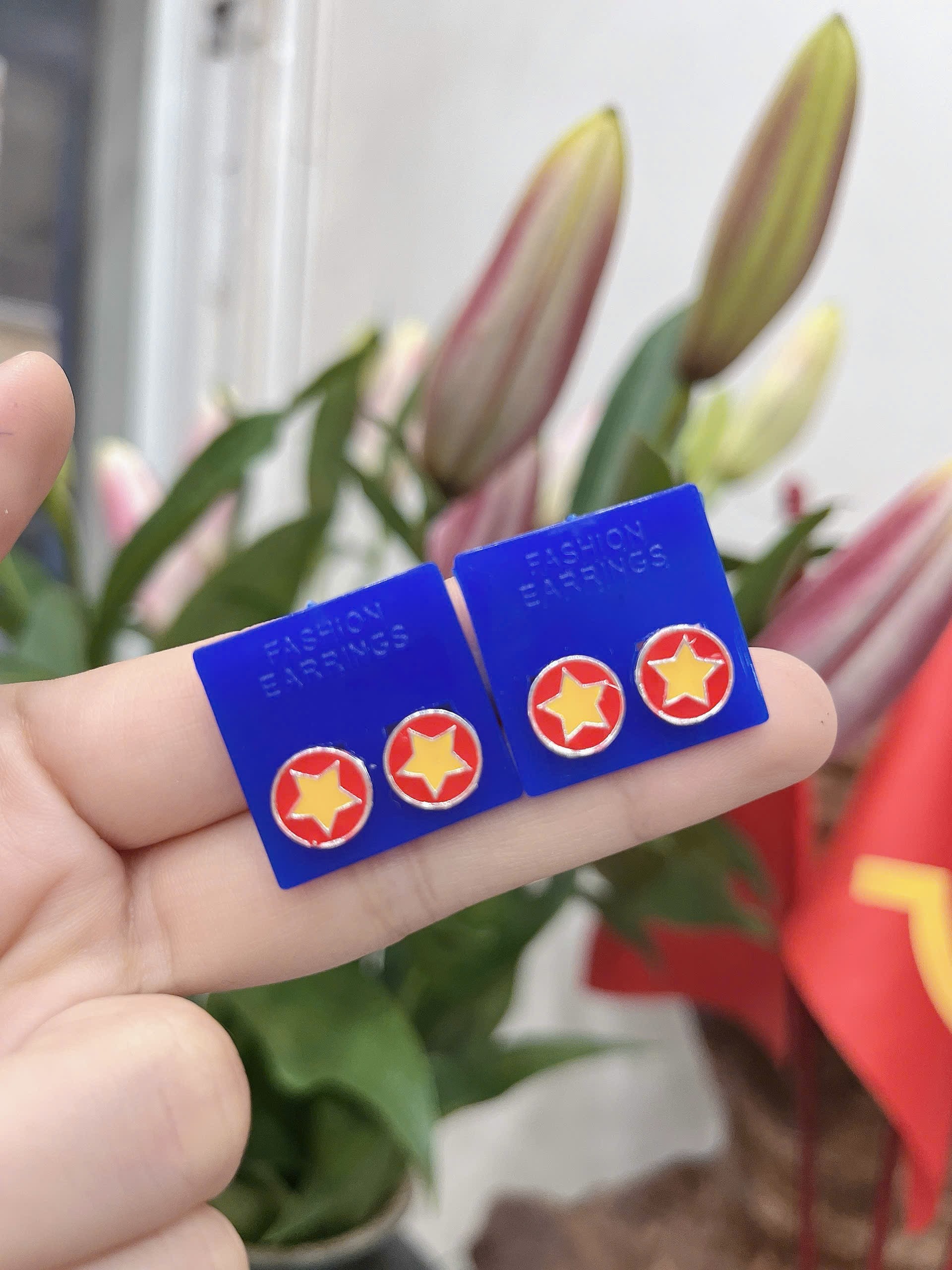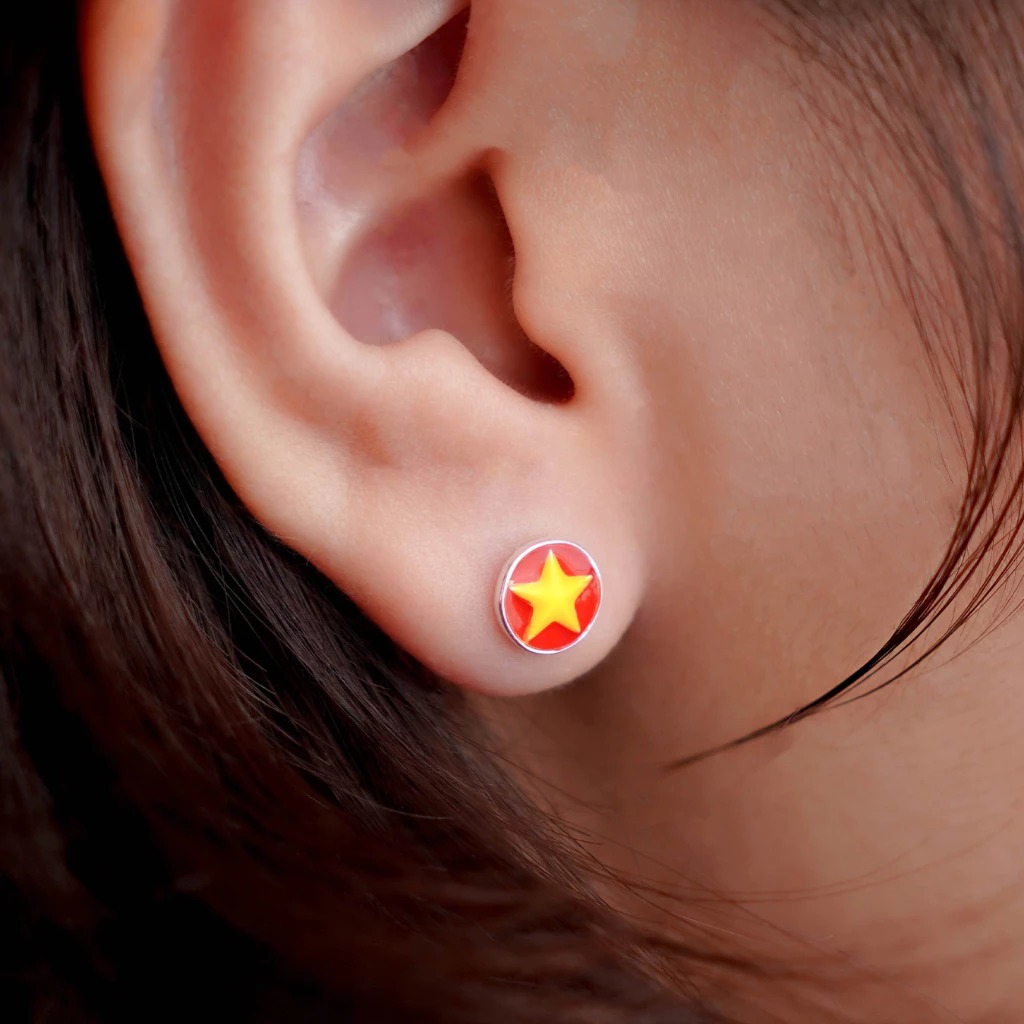 Hoa tai lá cờ đỏ sao vàng là trang sức có thiết kế giống lá Quốc kỳ Việt Nam, tượng trưng cho lòng yêu nước, tinh thần đoàn kết dân tộc, và niềm tự hào về độc lập, hòa bình của đất nước. Nền đỏ tượng trưng cho máu của các anh hùng, còn ngôi sao vàng năm cánh biểu thị sự đoàn kết của 5 tầng lớp sĩ, nông, công, thương, binh.