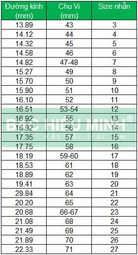 Khi đã biết đường kính của chiếc nhẫn mình cần, bạn tra vào bảng size nhẫn dưới đây để biết mã số phù hợp: